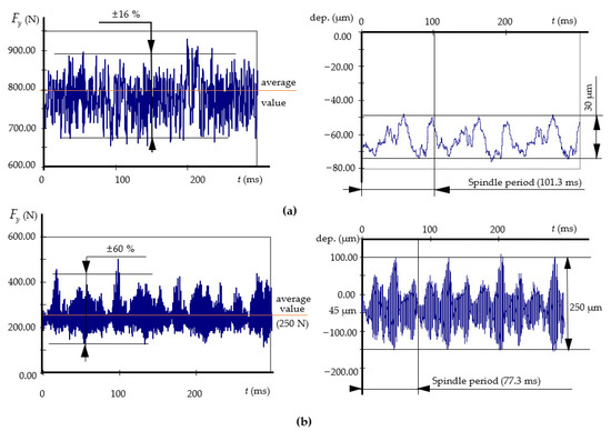 From these results, it can be concluded that the cutting forces and the quality of the machined surface depend not only on the choice of cutting parameters but also on the dynamic behavior of thin-walled parts due to their low rigidity and low structural damping during the machining operation. Figure 6 shows the variation of the tangential cutting force and of the radial displacement of the wall of the part, respectively, for the roughing test “R-3” (Figure 6a) and for the finishing test “F-2” (Figure 6b). In roughing, the cutting process is accompanied by low amplitude vibrations, while in finishing, the vibrations are intense.