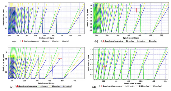 The stability zones within this research were analyzed using the stability lobe diagrams. These diagrams are based on a theoretical model capable of determining the stability zones of the cutting process in order to choose the appropriate cutting depth of a cut for a given spindle frequency. This cutting depth is located between a minimum theoretical value (zero) and a critical limit value. Beyond this limit value, the process becomes unstable. Figure 7 presents stability lobe diagrams relative to the considered input parameters in numerical and experimental tests for the 42CrMo4 steel alloy (Table 2). These diagrams were constructed using the equation of the critical depth of cut at a stability boundary limit and the spindle speed (N): (Equation (16) [29])