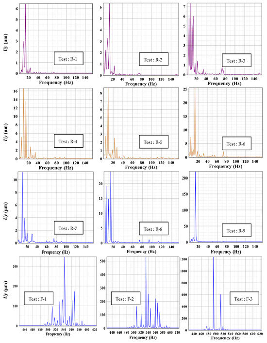 Figure 8 represents the FFT spectra of the experimental radial vibrations () of the workpiece wall during roughing and finishing operations. In the FFT spectrum, there is a difference in scales between the different tests according to their vibratory state discussed in Section 3.1 and their stability (or instability) degree discussed in Section 3.2. In fact, in the roughing cases (less unstable process), the amplitudes are much lower at the peak of the dominant frequencies than those obtained in the finishing case (more unstable process). These amplitudes are considered parameters to categorize stable and unstable processes.