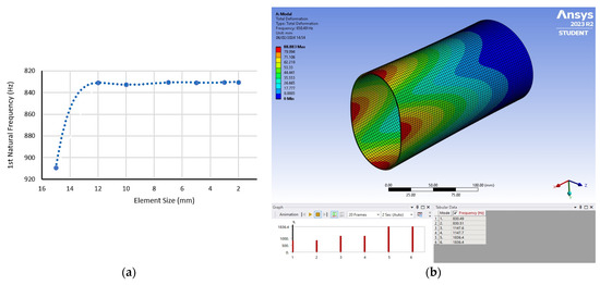 The lowest natural frequency, f1 = 830.49 Hz, was identified for the least stiff workpiece where the considered wall thickness was 1.5 mm; therefore, the analysis results of this workpiece were selected for presentation in this manuscript. A cubic element of size 5 mm was used for the numerical solution because the sensitive analysis (Figure 9a) showed a convergent behavior of the dependence of frequency—element size, and this element size was sufficiently accurate for the solution. Within the network, 7303 elements with 50,854 nodes were created for analysis.