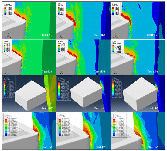 From Figure 10, it can be seen that, in the roughing operation of parts that are 3 mm thick, the stress increases when the feed rate increases. And for workpieces of 4.5 and 6 mm thickness, the stress is not too much influenced by the feed rate. For the finishing operation, the stresses reach their maximum values at the cutting-edge contact of the tool and the workpiece. Also, the primary and secondary shear zones can be distinguished.