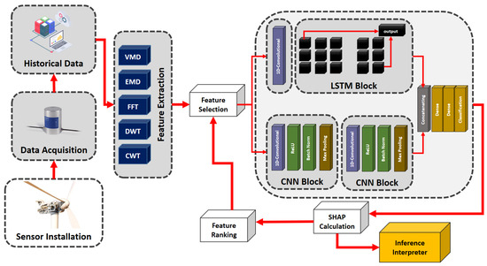 In order to fill this important gap, this paper presents an innovative method that aims to improve the performance of DL-based CM models and provide insight into their decision-making processes, thus promoting trust and transparency, as shown in Figure 9. Our proposed framework consists of a systematic four-step process, including (1) a comprehensive feature extraction phase, (2) advanced fault detection using a dual-path ConvLSTM architecture, (3) model optimization and feature refinement based on XAI principles, and (4) a dedicated module for interpreting inferences.