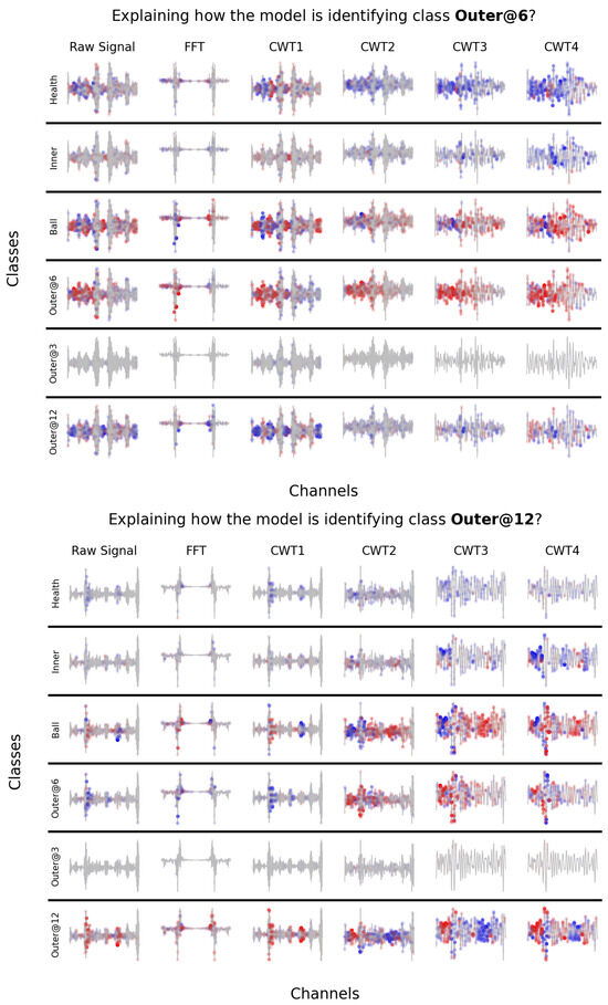 Figure 3 showcases two visualizations proposed in our XAI framework; these were created using the CWRU dataset and focus on two different categories: Centered (@6:00) and Opposite (@12:00) Outer Race faults. These visuals assist operators in clearly identifying which parts of the signal are related to the detected class (indicated by red dots) and why the sample does not align with other classes (marked by blue dots). The operator can acquire insights into the operation of the DL model by examining a small set of varied samples that are explained using the ExAI framework for signals. It is important to note that the SHAP explainer’s red and blue dots can only indicate the importance of patterns for the AI model’s decision. It is the operator’s responsibility to assess whether these patterns hold any significant relevance to the specific class.