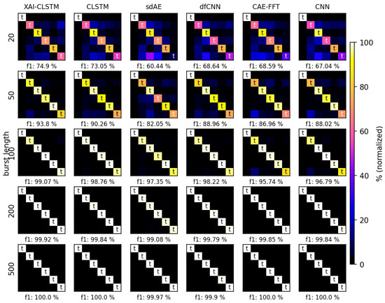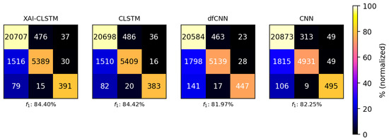 To evaluate how well this framework works in feature selection, this study compared it with several top models: our proposed model (XAI-CLSTM), CLSTM [9], sdAE [33], a dfCNN [34], CAE-fft [35], and a CNN [36].