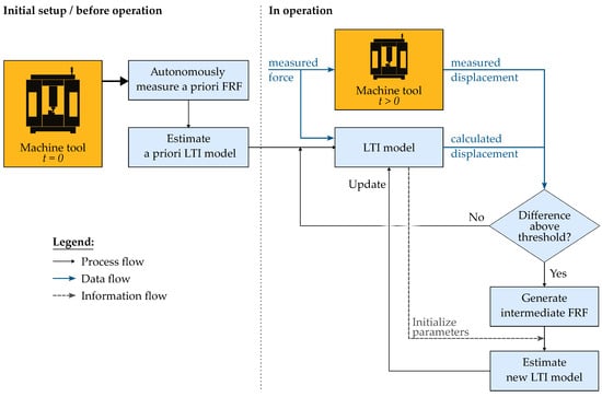 Methodology of the approach for modeling the dynamic behavior. The initial setup of the machine tool LTI model is performed at (Section 2.2). During the machine tool’s lifetime , its dynamic behavior changes and the update procedure is conducted (Section 2.3).