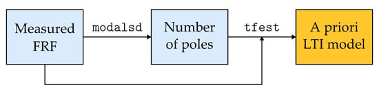 The detailed procedure for estimating the a priori LTI model for each measured point in the workspace of the machine tool is shown in Figure 2. First, the number of poles of the measured FRF is determined by evaluating the output of the Matlab® Signal Processing Toolbox (Version 23.2 R2023b) function modalsd. This function computes the natural frequencies of the measured FRF that are stable between successive model orders. The transfer function of the a priori LTI model is then estimated by using the Matlab® System Identification Toolbox (Version 23.2 R2023b) algorithm tfest.