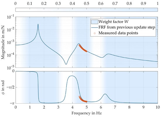 The tfest algorithm is applied to this intermediate FRF in a comparable way to the estimation of the a priori LTI model. But this time, the algorithm is initialized by using the parameters for numerator and denominator from the previous update step. Here, it must be noted that, when performing the initial update to match the behavior of the a priori model to operating conditions, the algorithm is initialized with the parameters from the a priori LTI model. As there are steps in the intermediate FRF, the frequency-dependent weighting factor (Equation (2)) is also defined preliminary to the optimization. As shown in Figure 3 the factor is set to one at the frequencies where the newly measured data points are inserted and where the values of the previous FRF are maintained. An uncertainty range around the measured data points and at the frequency is defined. There, the frequency-dependent weight factor is selected to be less than one. The uncertainty range could be determined by examining the influence of the eigenmodes that could be identified as significantly different from the current LTI model based on the measured data. The frequency-dependent values for are selected such that the new data points that generate the step in the intermediate FRF are smoothly faded in. Figure 3 illustrates how could look like. The exact construction of the frequency-dependent weighting factor is investigated in further research.