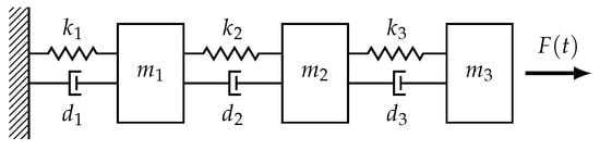 The main focus of this paper is the introduction of a concept for the individual and lifetime-adaptive modeling of the dynamic behavior of machine tools. Initial tests have been conducted in virtual space to get a first impression of the application of the concept explained in Section 2.1, Section 2.2 and Section 2.3 and to validate its capabilities. In this section, the results of these preliminary tests are presented. For this purpose, a simplified three-DoF model was used as a reference model within the simulation, as shown in Figure 4. It is important to note that this three-DoF model does not represent an actual machine tool. However, this model should be sufficient enough for testing the algorithm under controlled conditions.