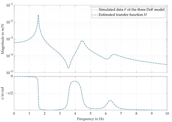 Comparison of the simulated FRF of the three-DoF model (Figure 4) and the FRF obtained through estimation.