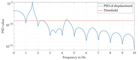 To validate the update process, the model is excited with real measured milling forces, as shown in Figure 6, because simulated milling forces may not fully capture the complexities present in real-world scenarios. This allows one to validate the updating process in a more realistic scenario. The displacement of mass , representing the system’s response, is simulated. To identify the frequencies where the system is significantly excited by these milling forces, the displacement PSD is calculated as shown in Figure 7. A threshold value is set and the frequencies that exceed this threshold value are determined. In this example, this threshold is set to . It is important to note that the choice of the threshold value plays a key role in determining the frequencies, as it directly affects the subsequent construction of the intermediate FRF. Once the frequencies have been determined, the measured data points to be inserted into the intermediate FRF are calculated. This is performed by calculating the Fourier transform of the measured force and displacement at the determined frequencies.