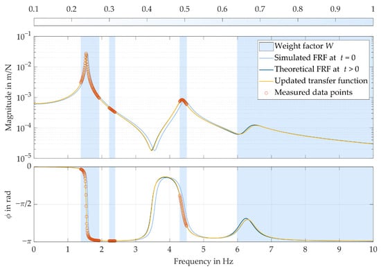 Figure 9 displays the result of the parameter update, showing the FRF of the updated transfer function. In addition, the weight factor is visually represented by color coding the frequency ranges. For comparison, a complete FRF of the system with the stiffness parameter changed by 10% was simulated (theoretical FRF at ). The FRF of the updated transfer function shows a fit to the theoretical FRF at of 95.23%. Better results could be achieved by further optimizing the weighting factor in future research.