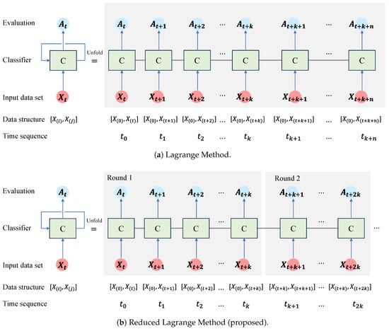Figure 1b illustrates the Reduced Lagrange Method (R-LM). Unlike the LM, data set , which is considered normal and pseudolabeled as normal, is used only k times as a normal data set. In the kth time sequence, the normal data set changes to and is maintained k times. Round 1 is denoted by , thereby maintaining a normal data set k times. For each time sequence, a predesigned data set is constructed and used as input for the classifier. Values for the classification performance metric (e.g., accuracy) generated by the classifier are saved and analyzed. The series of processes is repeated for each time sequence within a round. Each round has k repetitions, which must be determined by the user. A fixed data set that is pseudolabeled as normal is used k times within a round. In Round 1, the data structure of is a pseudonormal data set, which is used k times. This way, the fixed data set can be labeled as normal, and the next data set can be labeled as abnormal, thereby resulting in a data set that can be input into the classifier. No classifier will be able to differentiate between the two data sets if they are derived from the same homogeneous group. Data can be classified by using a classifier if equipment conditions change and the data in the data sets change. Classification accuracy will increase when equipment changes are large, so it can be used as a diagnostic tool to diagnose equipment problems. In order to determine k, the user must take into account the characteristics of the equipment and how quickly the alarm must sound. The LM does not set the k value, so it continues to use data from one point in the past as a normal label. There are limitations to this approach, because the range of normal states may shift periodically depending on operating conditions where field equipment repeats acceleration and deceleration. The normal data set from the equipment needs to reflect normal maintenance activities such as overhauls, minor repairs, and oil changes.