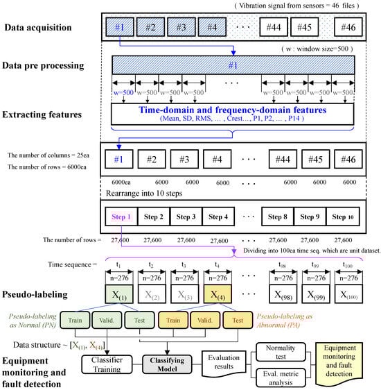It is necessary to prepare an input data set in order to monitor the condition of the equipment. These are the data sets labeled normal (N) and abnormal (A) for input. The input data pair should be normalized so that the mean is 0 and the standard deviation is 1, and then the data set should be divided into training, validation, and testing data sets at a certain ratio. In order to calculate relative variable importance, use a random forest (RF) algorithm and sort in descending order. In order to train a classifier, the variables ranked in the top 10 are used. The evaluation metric should be calculated using testing data. For each time sequence, k classifier operations are performed, and the evaluation results are calculated. A normality test is performed on the data set that contains the evaluation results. A p value less than 0.05 suggests that the sample did not originate from a normal distribution, and, therefore, the equipment condition has changed. If the p value is greater than 0.05, we can say that it follows a normal distribution, meaning no characteristics have changed. If the average value of the accumulated evaluation result is greater than 0.7, an alert is generated; if it is greater than 0.8, an alarm is generated, and if it is greater than 0.9, a warning signal is generated. This content can be expressed with the Algorithm 1. Figure 2 shows the procedure for equipment monitoring and fault detection. First, after data acquisition, preprocessing is performed, and features are extracted. After performing pseudolabeling, the data set is divided into train, test, and validation data to learn a classification model and monitor equipment abnormalities by reviewing evaluation indicators.