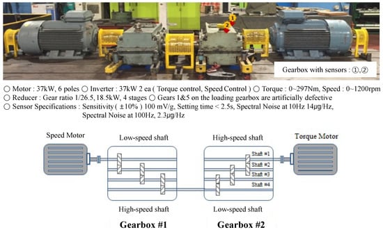 A gearbox is a fundamental component of rotating machinery that transmits power between the shafts used in steel mills, power turbines, automobiles, and airplanes. As a result, fault detection and diagnosis (FDD) for gearboxes is essential to prevent mechanical malfunctions that could damage the systems. Among single-equipment failures, gearbox-related failures were found to be the highest in one steel company at 38%. As the types of steel produced become more diverse, machines operate at higher loads than they were designed for. A sudden failure of a gearbox can cause quality defects, expensive repairs, and even accidents. The health of a gearbox can be confirmed by measuring the vibrations, acoustics, heat, and iron content in lubricants. Among these, vibration signals are the most widely used because they contain a lot of information from inside the mechanical equipment. In order to monitor gearbox conditions and detect defects early, various technologies such as artificial intelligence and signal processing are being researched [,,,,,,,,,].