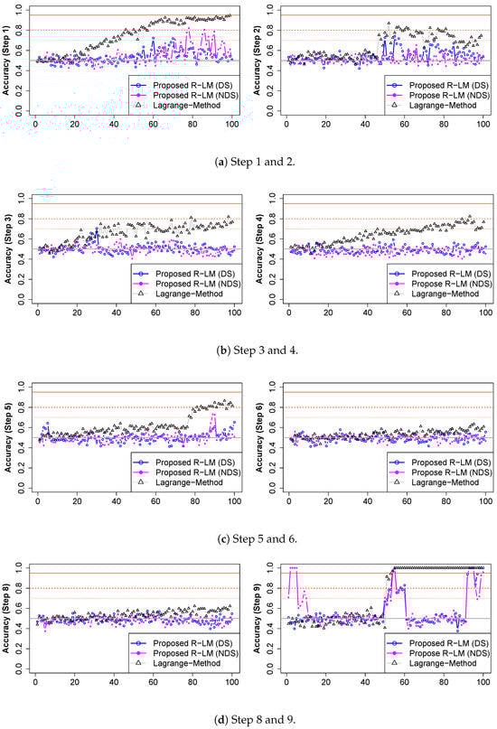 Figure 4 shows how the classification accuracy changed with time for each step. The black triangles on the graphs indicate changes in the LM’s classification accuracy. In Step 1, the classification accuracy started at 0.5 and gradually increased, thus reaching 0.9 around time sequence 65. The results are caused by the naturally increased vibration as the rotation speed of the motor connected to the gearbox increases. The LM has two limitations: it generates false alarms from normal changes, and it is difficult to detect changes in the equipment status when smaller changes are accumulating. Classification accuracy values by the proposed Reduced Lagrange Method are shown in blue (DS) and magenta (NDS). The proposed R-LM showed classification accuracy values of around 0.5 up to time sequence 60, but the accuracy began to increase only at the point at which the equipment status was estimated to have changed. The LM can be used to identify changes in the status of equipment over time when a specific set of data can be maintained with confidence in a steady state. However, the proposed R-LM responds sensitively to changes within the predesigned round size interval (k). It is possible to check this in Steps 3 and 4. While the LM’s classification accuracy value increased gently over time, the proposed R-LM had a constant value around 0.5. Steps 6 and 7 did not show meaningful changes in the equipment status from either the LM or the proposed R-LM. There was a catastrophic failure in Step 8. The LM showed a rapid change in equipment status starting at time sequence 50, which indicated an increase in classification accuracy. The proposed R-LM also showed rapid changes in equipment status at time sequence 50 and at two peaks. When the equipment status changed and remained there, the classification accuracy values from the R-LM were low. This is characteristic of the R-LM, which only responds when equipment conditions change. The analysis of the vibration signal on the nondrive side showed high classification accuracy in time sequences 1 to 10 of Step 8. That means that abnormal signals can be generated before catastrophic failures occur in the equipment. False alarms may cause field maintenance workers to lose confidence in the equipment monitoring system, so minimizing false alarms is important. Pseudolabeling provides limited information for fault detection and diagnosis, because it does not accurately match normal and abnormal field labels. If event data generated from equipment operation and maintenance are analyzed with false alarms, they can be reduced. Maintenance resources can be utilized more efficiently by reducing false alarms. In Table 3, changes are shown in the accuracy, precision, specificity, and sensitivity. One value is the average of the top five ranked values of 100 evaluation metrics. When it exceeds 0.7, an alarm occurs, and if it exceeds 0.95, a warning occurs. In Step 4, the LM generated false alarms with increasing classification accuracy, but the proposed R-LM remained within a classification accuracy of 0.5.
