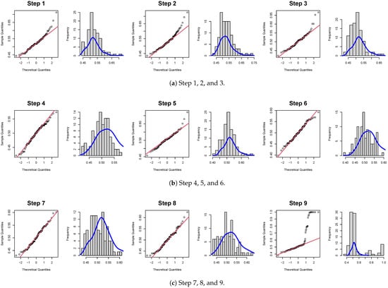 Based on classification accuracy data, it can be determined that the vibration data acquired during this time were derived from a homogeneous sample. That means that there were no significant changes to the equipment. In Figure 5, we can see that the classification accuracy data for Steps 1, 2, 3, 9, and 10 are not normally distributed. We performed a hypothesis test for normality to quantitatively confirm this. Table 4 shows that the steps with a p value of 0.05 or less are Steps 1, 2, 3, 9, and 10 for the drive side and Steps 1, 2, 3, 5, 9, and 10 for the nondrive side. Since a catastrophic failure occurred in Step 9, it confirmed that signs of equipment abnormalities had already appeared in Steps 1, 2, and 3. As a result, the normality test result for the classification accuracy values obtained by assigning a pseudolabel to the data set and applying the Reduced Lagrange Method can be classified as abnormal (A) if the p value is less than 0.05, and the result can be classified as normal if the p value is greater than 0.05. An alarm signal can thus be generated when the status of the equipment changes.