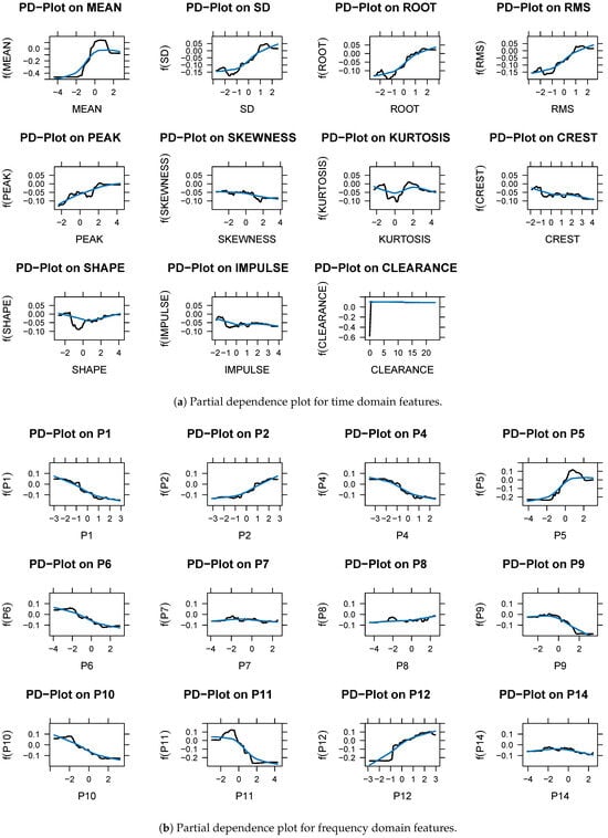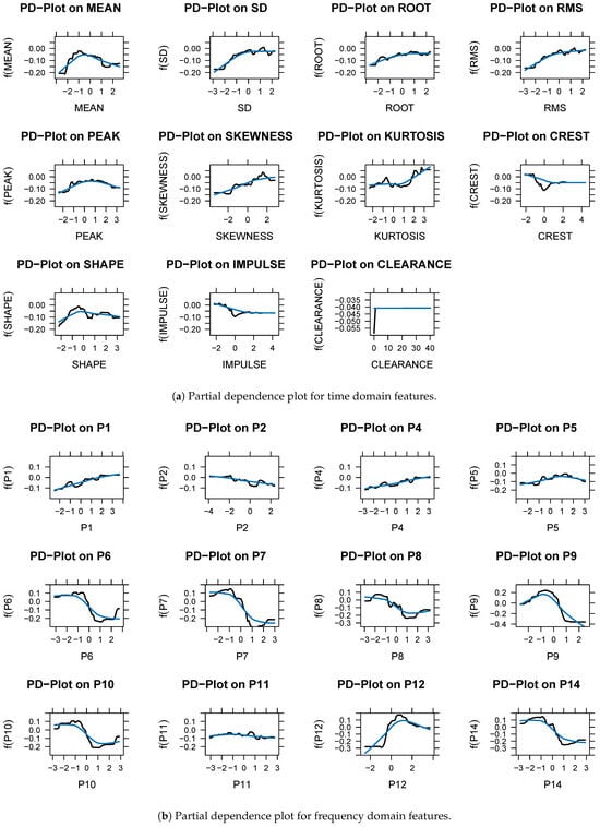 In binary classification, frequency domain features have a more significant role than time domain features. The frequency domain features ranked relatively high and were selected as important features in the variable importance analysis. Through partial dependency analysis, we can confirm the direction of change, as well as the influence of the variables. A partial dependence plot (PDP) in the time domain is shown in Figure 6 and Figure 7. A PDP represents how features affect the target variable of the prediction model. The x axis and the y axis represent the feature value and predicted abnormality, respectively. Features , , , , , and were rarely considered abnormal, even when they increased in value. There are some features that are not related to the target variables even if their values change. Skewness, kurtosis, crest, shape, impulse, and , , and are representative examples. Figure 6a,b show the partial dependence analysis results for each feature extracted from the NDS. Upon analyzing the features extracted from the vibration signal on the nondrive side, SD, root, RMS, skewness, and and , the target variable was judged to be abnormal as the feature value increased. When the feature value became smaller, , , , , , and tended to be considered normal. There are some features that do not have a meaningful relationship with the target variable, no matter how their values changed. The mean, peak, kurtosis, crest, shape, and impulse, plus , , , and are examples. Alarms are generated in the field when the vibration average value (a time domain feature) exceeds a set value. Time domain features are used in the field to generate alarms, but they have limitations. A frequency domain feature can therefore be used to predict equipment status changes more accurately than a time domain feature. Data analysis in the frequency domain is essential, along with data analysis in the time domain.