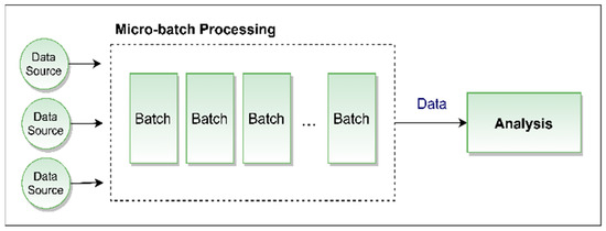 Micro-batch processing breaks down ETL operations into smaller chunks, usually encompassing data for about a minute. This aligns well with digital twin models of complex systems, facilitating near-real-time data access. Although this method does not allow for real-time adaptation, it supports the integration of new data during model updates, enhancing subsequent analysis accuracy [35]. Studies indicate that micro-batch processing often outperforms stream processing in accuracy when analyzing stored data, owing to its repetitive nature. The structure of micro-batch processing is depicted in Figure 1.