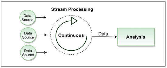 Stream processing is a real-time computational method that processes data as it arrives [35]. It enables rapid computations with typical latencies ranging from milliseconds to seconds and is incrementally adaptive to new data streams. This approach is especially effective when data relevance is more immediate and less dependent on historical records.