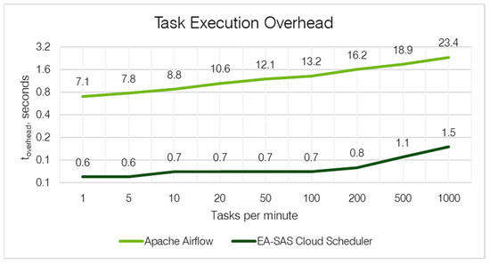 The synthesis of our findings is encapsulated in Table 4 and Figure 5, which collectively demonstrate a direct relationship between task count increments and execution time. Apache Airflow consistently manifested more substantial lags in comparison to the EA-SAS Cloud Scheduler. For example, when handling 1000 tasks per minute, the EA-SAS Cloud Scheduler maintained a lean overhead of just 1.5 s, whereas Apache Airflow lagged with an overhead of 23.4 s.