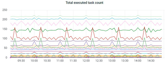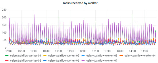 EA-SAS Cloud currently operates through Apache Airflow and has seven workers. Metering the data of task distribution between workers is depicted in Figure 6. The total executed task count between various digital twins is depicted in Figure 7. Each of the colors represents a different digital twin. Names of the companies are not shown due to confidentiality reasons.