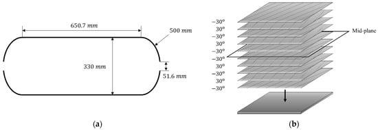 Type 2 composite overwrapped pressure vessel model: (a) geometry; (b) stacking sequence.