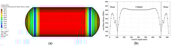 (a) Von Mises stress distribution in steel liner; (b) von Mises stress in longitudinal direction for steel liner.