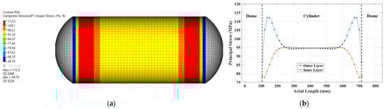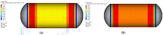 The maximum principal stress occurred in the 10th ply of the composite layer. The most deformation occurred at the ends of the cylinder adjacent to the dome, resulting in a lower principal stress. However, the maximum principal stress was calculated to be 112.0 MPa at a point 40 mm from both ends of the composite layer. A comparison of the principal stress distribution in the outer layer and the inner layer is shown in Figure 5b. From the inside out, principal stress was calculated to be higher near the edges of the cylinder, and there was little difference in the principal stress in the center of the cylinder. The results of the maximum principal stress calculation according to the stacking order are shown in Figure 6.