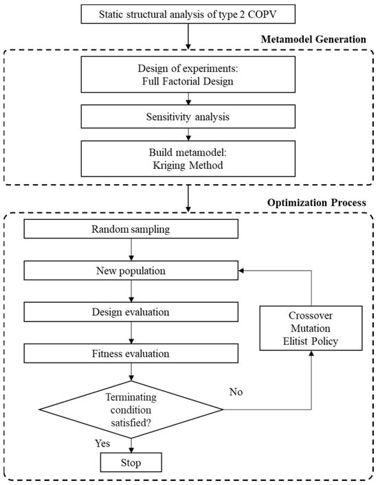 Figure 8 is a flowchart showing the research procedure of weight minimization in this study. First, the initial Type 2 COPV model was subjected to internal pressure, and the finite element analysis was performed to calculate the von Mises stresses in the steel liner and the principal stresses in the composite layer. A full factorial design (FFD) was performed to generate sampling data. A sensitivity analysis using FFD data was then performed to analyze the effect of the design variables on the responses. Then, significant design variables were used to generate the kriging metamodel. Next, we created an optimal design problem formulation to minimize the weight while satisfying the safety constraints of the composite layer and steel liner. The optimization was performed using the genetic algorithm (GA) that guarantees a global optimal solution.