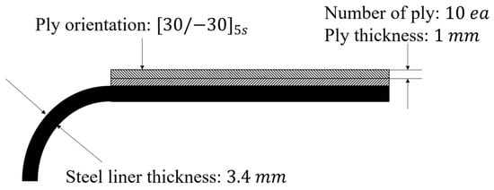 The design parameters were set to minimize the weight of the Type 2 COPV considering the manufacturing process. Four design variables were selected: steel liner thickness () and ply thickness (), which affect the weight, and ply orientation () and number of plies (), which affect the failure of the composite structure. This is shown in Figure 9. The steel liner thickness was set as a design variable to consider the failure of the dome part, and the ply thickness, ply orientation, and number of plies were set as design variables considering the characteristics of the COPV manufactured through the filament winding method.