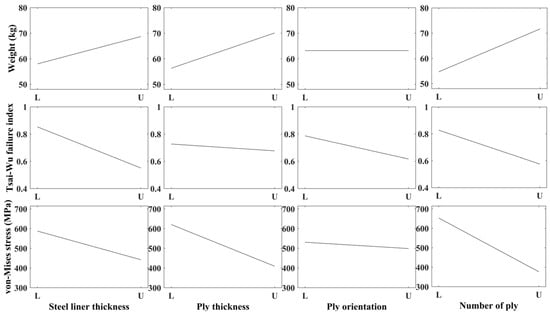 Figure 10 shows the effect of design variables on the responses using ANOM, where L represents the lower bound of each design variable and U represents the upper bound of each design variable. As shown in Figure 10, the design variable that has the greatest effect on weight is the number of plies, with ply orientation having no effect. For the Tsai–Wu failure index of the composite layer, steel liner thickness, ply orientation, and the number of plies have influence, in that order. The design variables that affect the von Mises stress of the steel liner are the number of plies, ply thickness, and steel liner thickness. Given the sensitivity of the design variables to the responses, all the initially set design variables are considered to be significant.