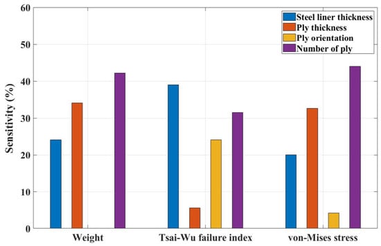 Figure 11 shows the significance of the design variables on the responses using the sensitivity analysis. While changing the ply orientation does not affect the weight, it does affect the Tsai–Wu failure index and von Mises stress. In addition, the other design variables, such as steel liner thickness, ply thickness, and the number of plies, were identified as influencing all three responses.