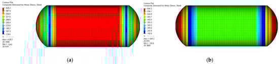 A static structural analysis was performed on the Type 2 COPV to calculate the maximum von Mises stresses developed in the steel liner, the maximum principal stresses imposed on each layer of the composite and the Tai-Wu failure index. At first, the least deformation occurred near the cylinder wrapped by the composite layer in the steel liner, resulting in a maximum von Mises stress of 420.2 MPa. This is shown in Figure 4.