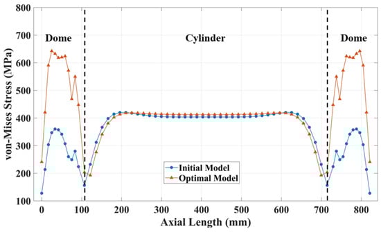 The finite element analysis was performed using the optimal solution of the calculated design parameters and compared with the initial analysis values. The von Mises stress distribution in the optimization model is shown in Figure 13 and Figure 14. As the steel thickness decreased in comparison to the initial model, the von Mises stress distribution in the cylinder was the same, but a significant difference occurred in the dome section, where the maximum von Mises stress occurred.