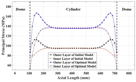 Comparison principal stress distribution in composite layer of initial and optimal model.