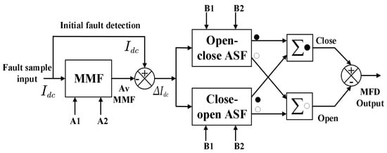 By cascading mathematical morphological operators, signals can undergo various processing effects. In order to filter out noise in photovoltaic systems and extract the signal characteristics of fault arcs, this section designs a multi-level mathematical morphological filter, called Mathematical Morphological Fault Arc Detector (MFD), as shown in Figure 3 [], through different combinations of mathematical morphological operators.