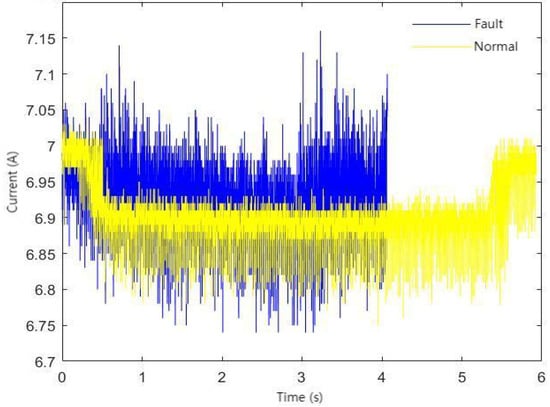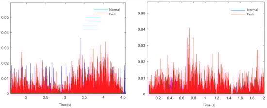 Comparing the output signals after the MFD transformation of the normal and fault arc current signals, as shown in Figure 4, it can be observed that the majority of the output signal after the MFD transformation for the normal condition is overshadowed by the output signal of the fault arc. The output values for the normal condition are mostly below 0.01, whereas for the fault arc condition, the outputs are generally between 0.01 and 0.05. Furthermore, most of the amplitudes are small, and the overall fluctuations are also relatively small. Statistical analysis can be utilized in the future to further differentiate between the two conditions.
