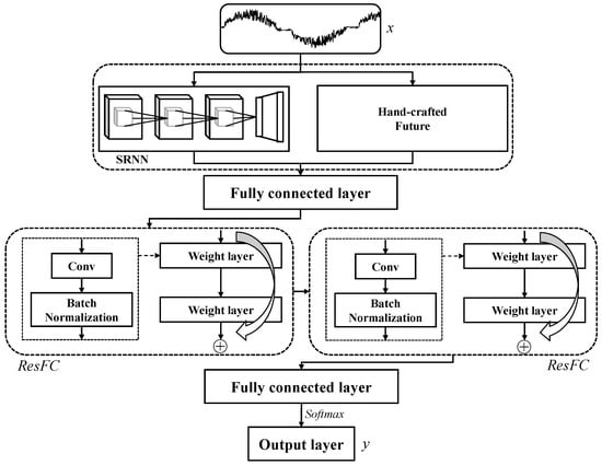 Figure 7 illustrates the experimental design for current fault diagnosis and prediction tasks, encompassing multiple key modules. Firstly, the SRNN module utilizes a recurrent neural network (RNN) for the automatic feature extraction of current data, and captures temporal information in current data, such as the changing trend of current over time, extracting features related to faults. Additionally, the Hand-crafted Feature module serves as a data module for manually extracting features [,]. These manually designed features can include frequency-domain features, amplitude features, waveform features, etc., accurately expressing crucial information in the current data. In comparison to automatic feature extraction, manually extracted features are more interpretable and enhance the model’s expressive capabilities and performance.