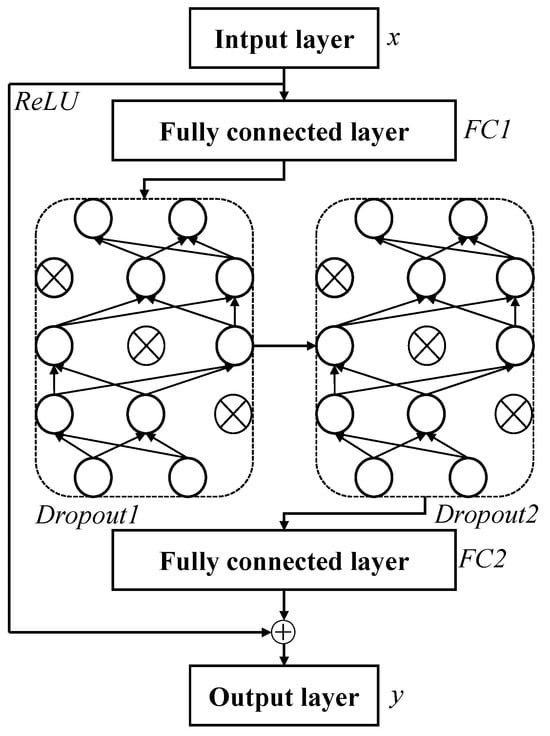 Additionally, the ResFC module is shown in Figure 8, which introduces a design with residual connections into the model. Deep models often learn more complex, abstract feature representations but are susceptible to the issues of vanishing or exploding gradients. To address this problem, the ResFC module, through the introduction of skip connections, allows information to pass directly through the network without excessive interference from multiple layers. This design of residual connections effectively alleviates gradient issues, improving the model training effectiveness and convergence speed. Furthermore, to further prevent the occurrence of overfitting, the ResFC module also employs Dropout technology to randomly discard the output of some neurons.