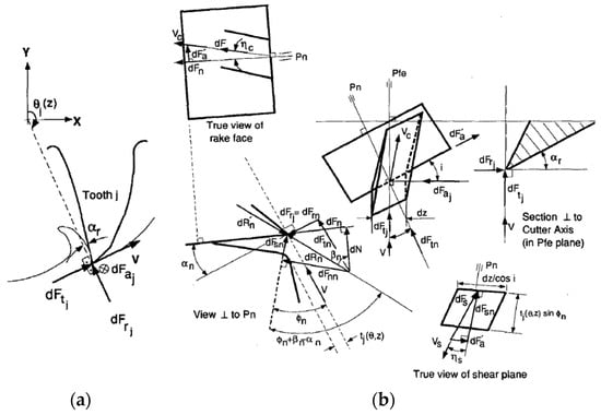 Modeling of milling forces: (a) The elemental cutting forces acting on flute j of an ideal system; (b) oblique cutting model for a milling tooth element [].