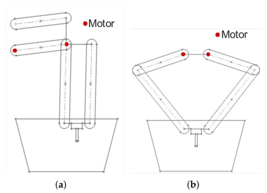 In this configuration, the arms can be oriented in the same direction or in opposite directions, as in Figure 1b. After analyzing the torque applied to the motors, it was concluded that it is equal in both cases. The decisive factor, therefore, was the simplicity of the design with the arms oriented in opposite directions.