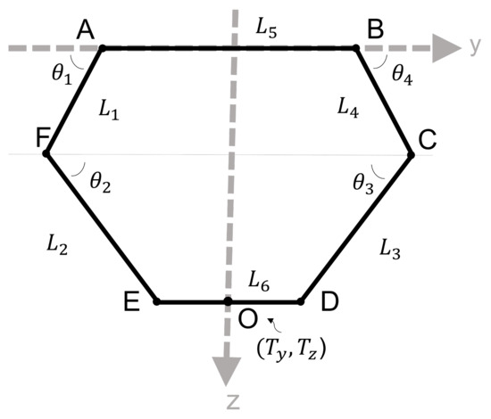 As shown in Figure 2, the D2 Delta robot will be responsible for controlling the motion along the y- and z-axes. The point of interest is the midpoint of the end-effector, referred to as “O”, with coordinates (Ty, Tz).
