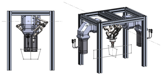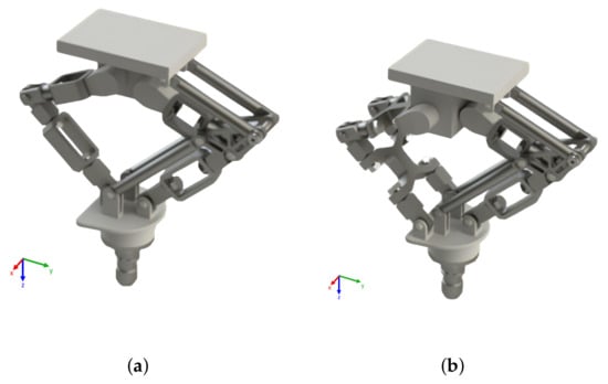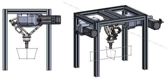 The configuration of a D2 Delta robot consists of two main arms, one on the right side and another on the left side, responsible for movement and force support, accompanied by one or two secondary arms to ensure platform parallelism, as demonstrated in Figure 3a. However, for processes involving horizontal forces, such as SPIF, it is preferable to use a configuration with three main arms in a triangular arrangement, as shown in Figure 3b. This configuration significantly increases the robot’s resistance to horizontal forces, providing greater efficiency.