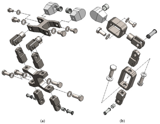 Figure 4, case (a), illustrates the assembly of the components of the main arms on the left side, and case (b) illustrates the assembly of the main arm on the right side.