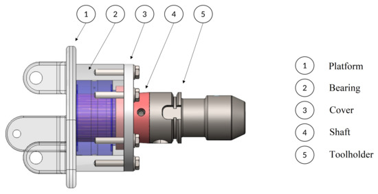 Figure 5 illustrates the main components of the system, which include a shaft connecting the platform to the tool holder, a bearing to ensure proper positioning and support for the shaft, and a cover to position and provide access to the components.