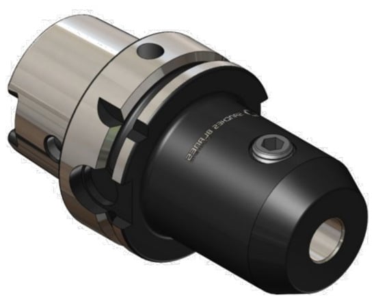 The CAT, ISO, and DIN cones are some of the many available different tool holders available [15] and represent the most prevalent and versatile types used in the industry. The housing is simple and does not have many requirements, making it ideal for prototypes and machines with manual tool changes. On the other hand, the HSK (Hohlfutter Schaft Konus) cone with a hollow shank is characterized by a flat cone–hole contact surface. It is especially suitable for high-speed machines due to its high balance, as well as high static and dynamic rigidity. Its centralized fixation allows for bending loads up to twice as high as common conical tool holders. The floating cone, on the other hand, is indicated for threading and reaming operations due to the complex balance of rotational and axial movement that occurs during thread generation. However, it is not recommended for processes involving radial fluctuations, as it does not provide resistance to bending.