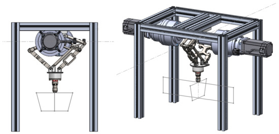 In the design of the mechanical structure, the optimization of the robot arms was carried out, along with direct and inverse kinematic analysis. The design of the kinematic system to meet the initial requirement of always performing forming normal to the sheet surface required exhaustive research on solutions used in the industry for three-axis motion. Another requirement that had an impact on the design of the kinematic system was the workspace and the forces involved in the process. This led to the adoption of a D2 Delta robot for the y- and z-axes and linear actuators for the x-axis.
