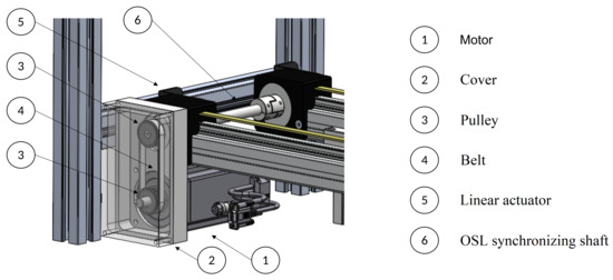 In order to make the system compact, the motor was positioned perpendicularly to the axis of the linear actuators. The transmission system between the motor shaft and the linear actuator shaft is accomplished using two pulleys and a belt, and the transmission between the two linear actuators is achieved through a synchronizing shaft of the OSL type, as shown in Figure 13.