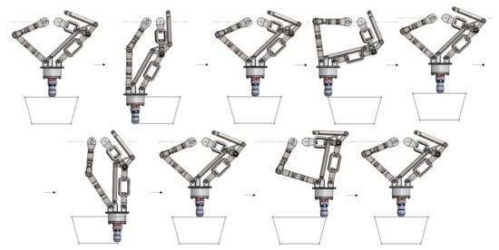 Two of the three main arms are aligned relative to the y-axis (on the left side) and move together, while the third arm (on the right side) is equidistant on the x-axis from the other two arms. To ensure synchronized movement between the two arms on the left side, they are connected by “X”-shaped components, allowing not only their movement together but also easy coupling between the components. The structure of the right-side arm is in the shape of an “O”, simplifying the coupling between components. On the same side, there are two secondary arms that ensure parallelism.
