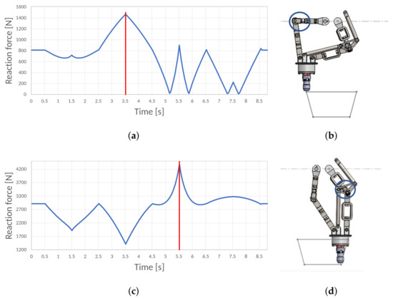 The universal coupler is purchased as a finished product, and similar to the previous component, it is crucial to examine the component located on both the right side and left side of the robot to ensure proper functioning. Figure 19 presents graphs that illustrate the reaction force over time and the position of the robot at the respective critical points.